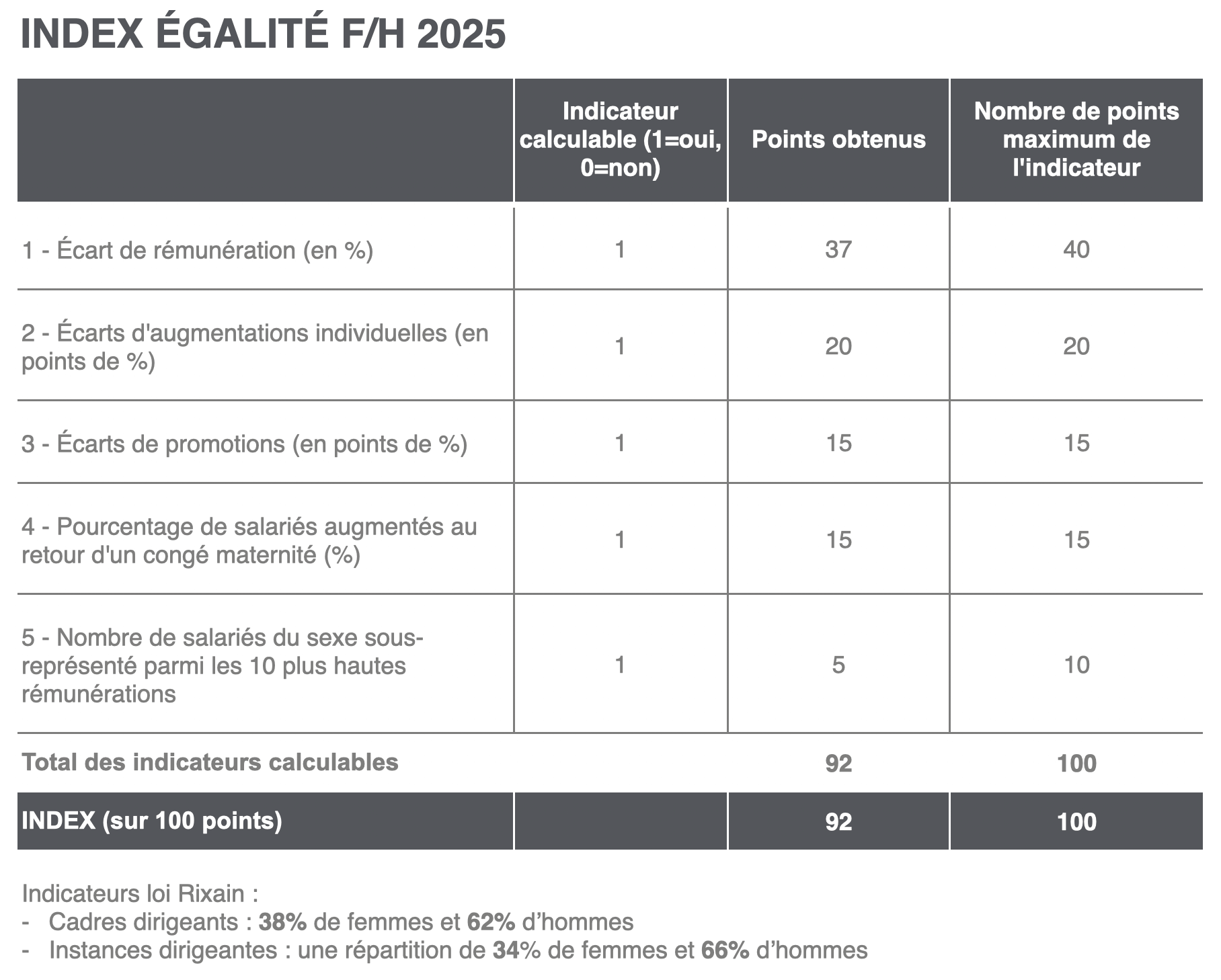 92/100 index de l'égalité professionnelle Femmes/Hommes (France, 2025)